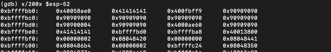 주소를 확인해보면 buf시작주소 = 0xbffffbb0, buf+48주소 = 0xbffffbe0이다.